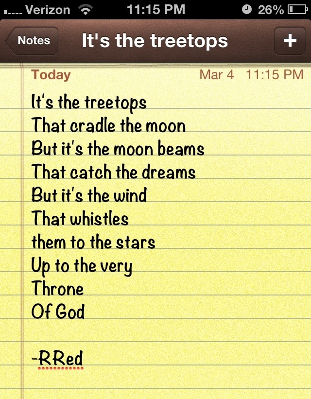Next Previous Tree Tops by R.RED March 5, 2014 1 comment For Fun, Poetry 28.494372 -81.527268 Share this: Click to share on X (Opens in new window) X Click to share on Facebook (Opens in new window) Facebook Like Loading... Related