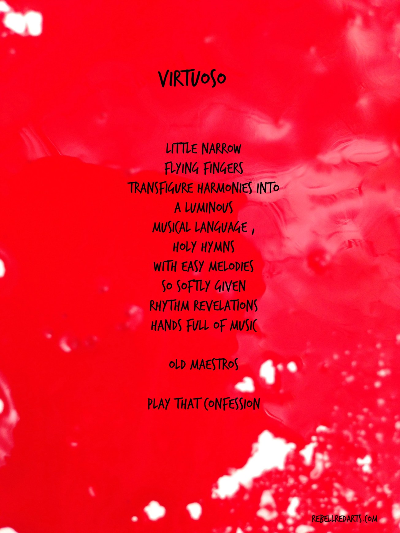 Virtuoso is a poem I created earlier this year. Here I have combined it over an old abstract painting from 2014. I love how paint captures the light while it is wet.